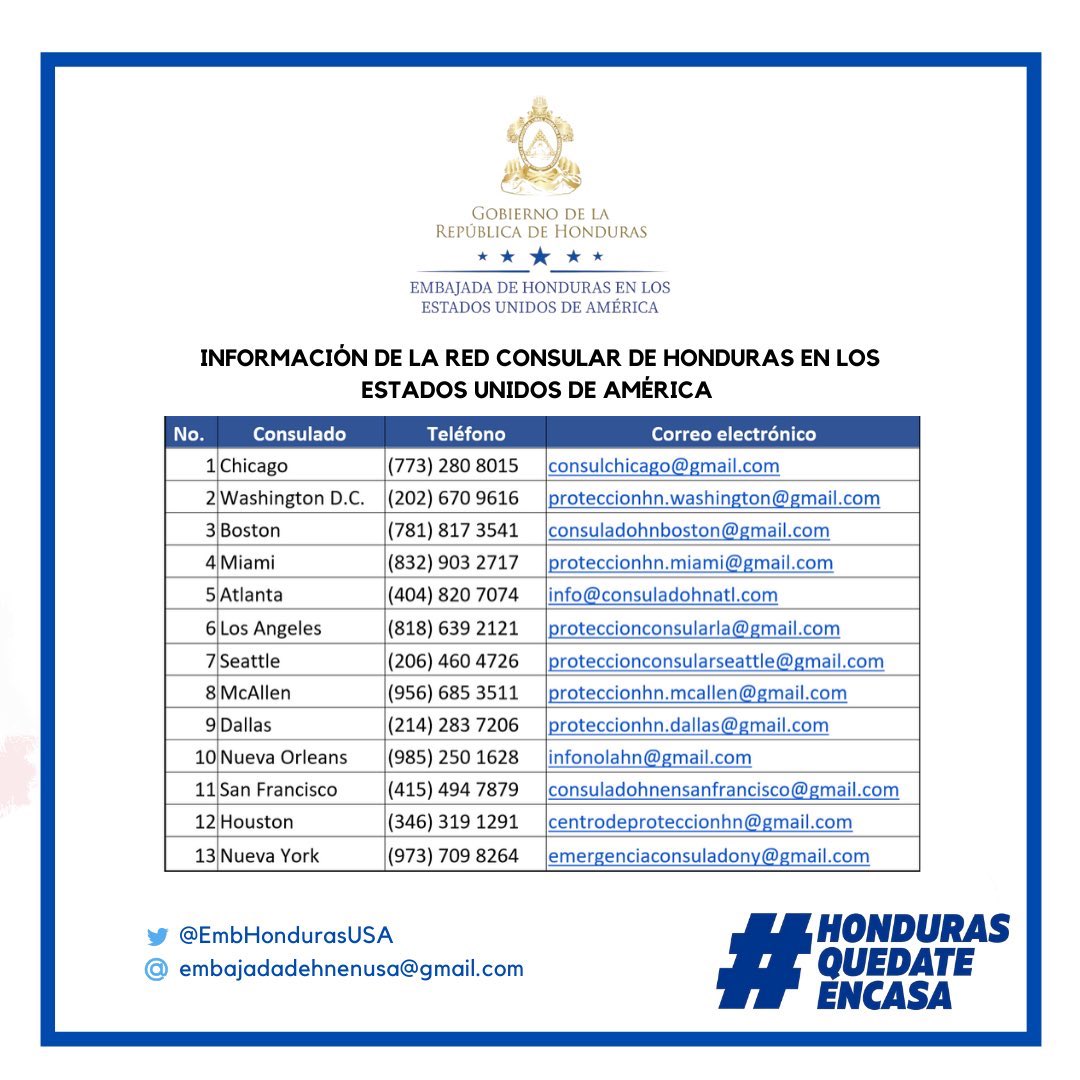 Consulado De Honduras - reviews, photos, phone number and ... Description. Consulado De Honduras belongs to the list that consists of Public services. This establishment is rated 3 by NiceLocal users and can be found in Florida city by the official address: Miami, FL 33166, consulado de honduras en.