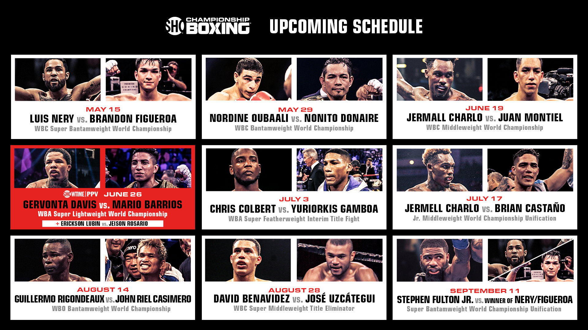 Showtime - Boxing Schedule SHOWTIME. Virgin Hotels, Las Vegas, Nevada. Saturday. Apr 16. WBA, IBF, WBC Welterweight Titles. ... Get in on the latest boxing conversations in our Forum and comment on articles.