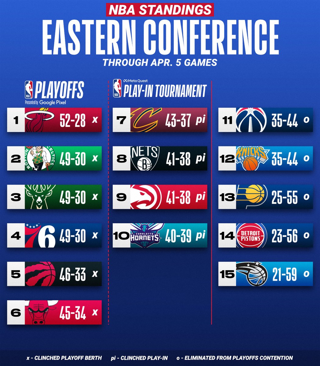 NBA Playoff Picture 2022: Updated Play-in Standings ... NBA Playoff Picture 2022: Updated Play-in Standings, Predictions After April 5 Joe Tansey @JTansey90 ... Eastern Conference. 1. Miami (52-28) 2. Boston (49-30) 3. Milwaukee (49-30) 4. Philadelphia ...